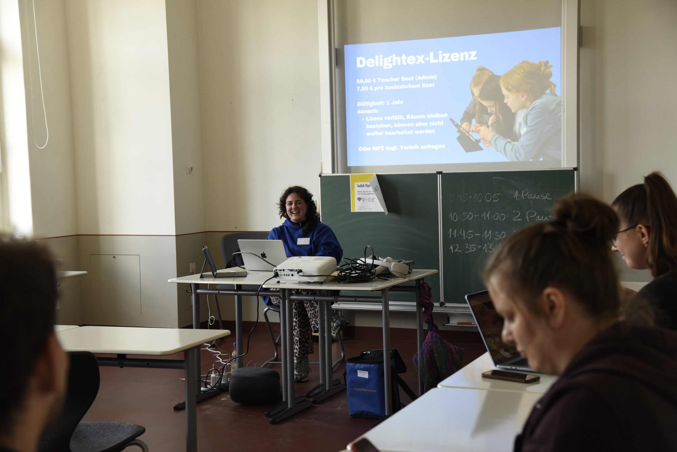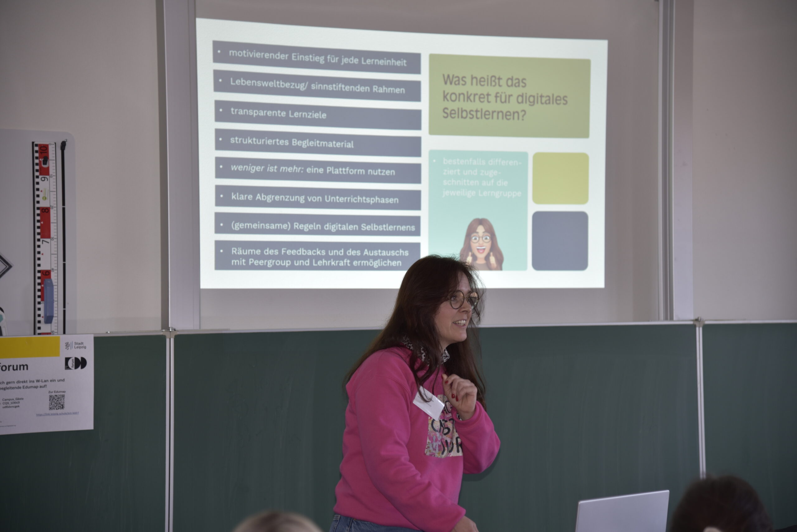 In den Themenfeldern „Digital gestütztes Selbstlernen fördern“, „Medienkompetenz leben und aktiv gestalten“ sowie „Schul- und Unterrichtsorganisation digital gestützt umsetzen“ wurden Praxisbeispiele aus Leipziger Schulen sowie Angebote von Initiativen des Arbeitskreis Medienpädagogik Leipzig vorgestellt. Das Forum zeigte dabei sehr konkret, wie „Kultur der Digitalität“ im schulischen Alltag Gestalt annehmen kann: So stellte ein Lehrer der Klaus-Gottschalk-Schule vor, wie digital gestütztes Selbstlernen mit LernSax und H5P Lernprozesse strukturieren und individualisieren kann; ein Vertreter der Schule Ihmelsstraße (Oberschule) zeigte wie Moodle im Selbstlernkonzept „Lernbüro“ eingesetzt wird; und die Nachbarschaftsschule gab, vertreten durch Dr. Franziska Bader, Einblicke in spannende Unterrichtsszenarien mit digitalen Tools.