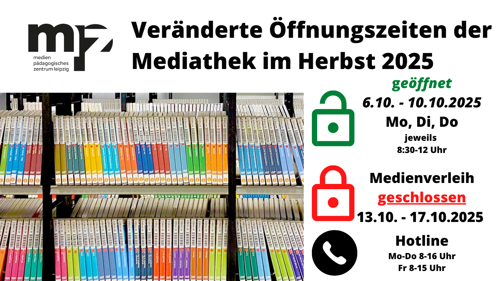 Die Mediathek des Medienpädagogischen Zentrums Leipzig ist in den Herbstferien 2025 im Zeitraum vom vom 06.10. bis 10.10.2025 zu folgenden Zeiten geöffnet: